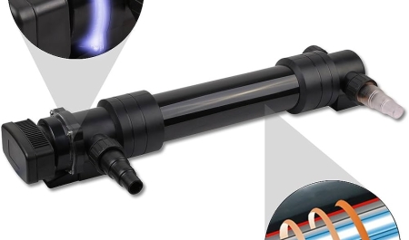 Đèn UV hồ cá (đèn tia cực tím) là thiết bị chuyên dụng dùng để diệt khuẩn, diệt rêu hại và làm sạch nước trong hồ cá cảnh, hồ koi hoặc bể thủy sinh. Thiết bị hoạt động bằng cách chiếu tia UV-C có bước sóng từ 200 – 280nm vào dòng nước, giúp phá vỡ cấu trúc DNA của vi khuẩn, nấm, tảo và các sinh vật có hại khác.